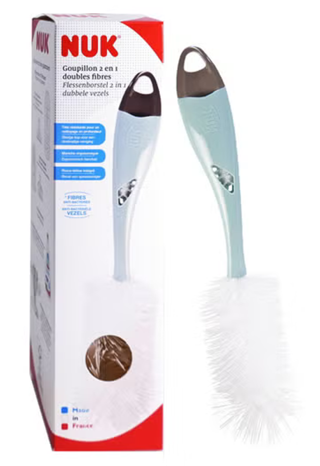 Le goupillon double fibre antibactérienne de NUK possède une brosse plus large particulièrement adaptée au nettoyage des biberons à large ouverture. Sa double fibre permet une double efficacité de nettoyage et sa tête résistante assure un nettoyage en profondeur du fond du biberon. Son corps plus doux prévient tout risque de rayure.