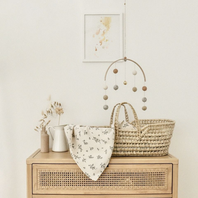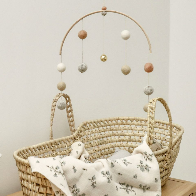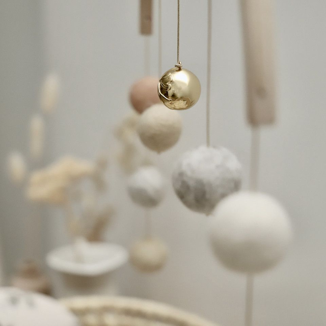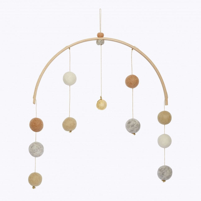 Ce mobile leger et poetique a ete imagine en collaboration avec la marque francaise CALM FOR DREAMERS. Au coeur de cet arc-en-ciel de boules feutrees, nous avons suspendu un Bola : sa melodie familiere accompagnera votre bebe vers un etat de calme et de detente en lui rappelant la securite et le bien-etre ressentis in utero.