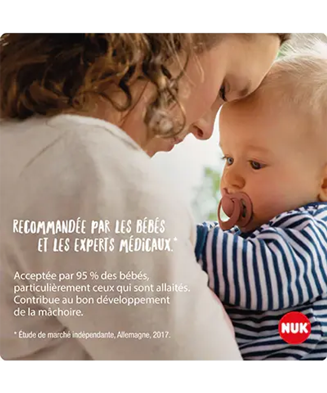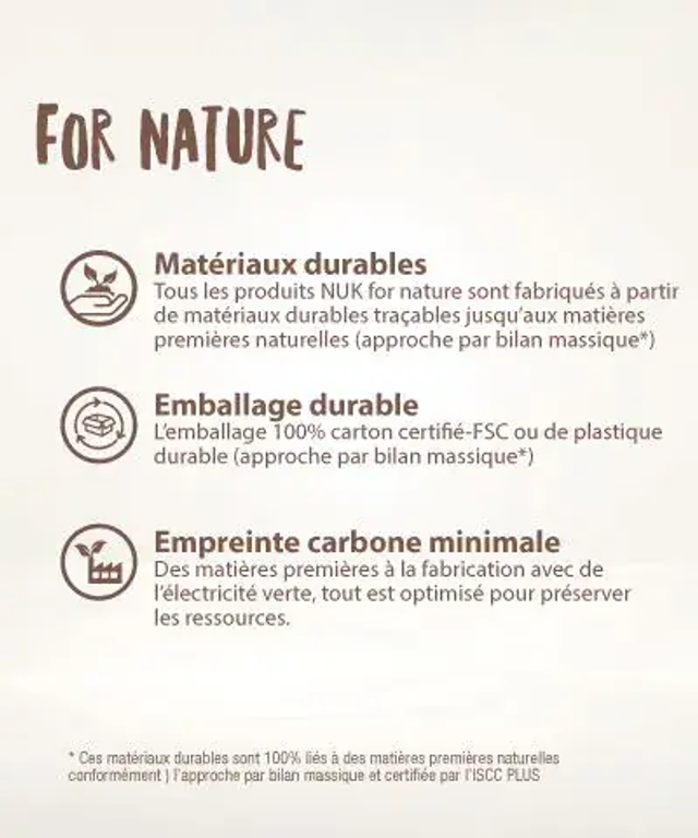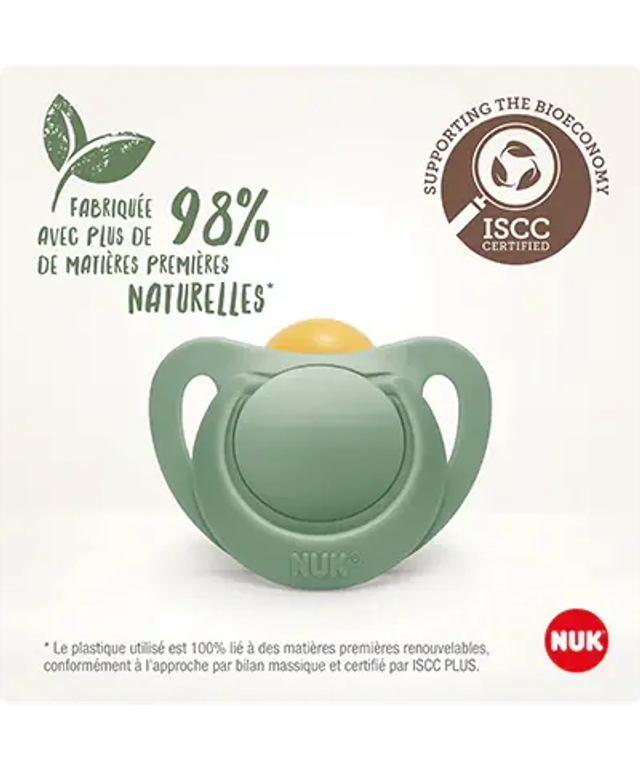 Apaise naturellement. C'est pourquoi notre sucette NUK for Nature n'a pas seulement une forme naturelle, elle est également fabriquée à partir de matières premières naturelles, emballée de manière écologique et sa production respecte la nature.