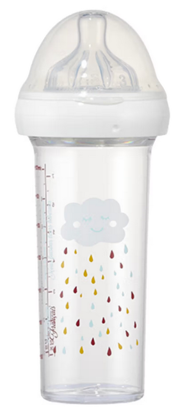 Ce biberon est gradué de 10ml en 10ml jusqu'à 210ml, il est parfait pour la naissance de bébé ou pour un relais à l'allaitement.