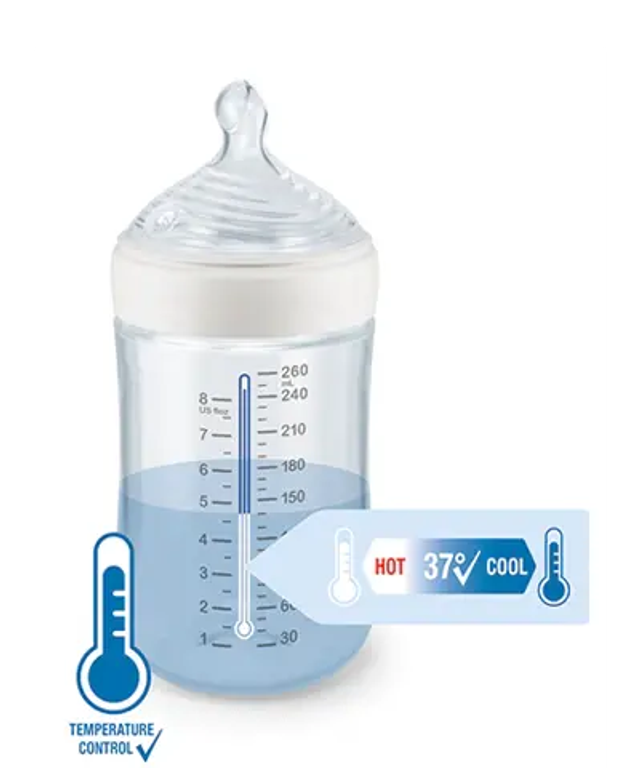 Avec affichage du contrôle de la température : permet de s'assurer que le biberon n'est pas trop chaud. Si le contenu est trop chaud, l'indicateur passe au blanc